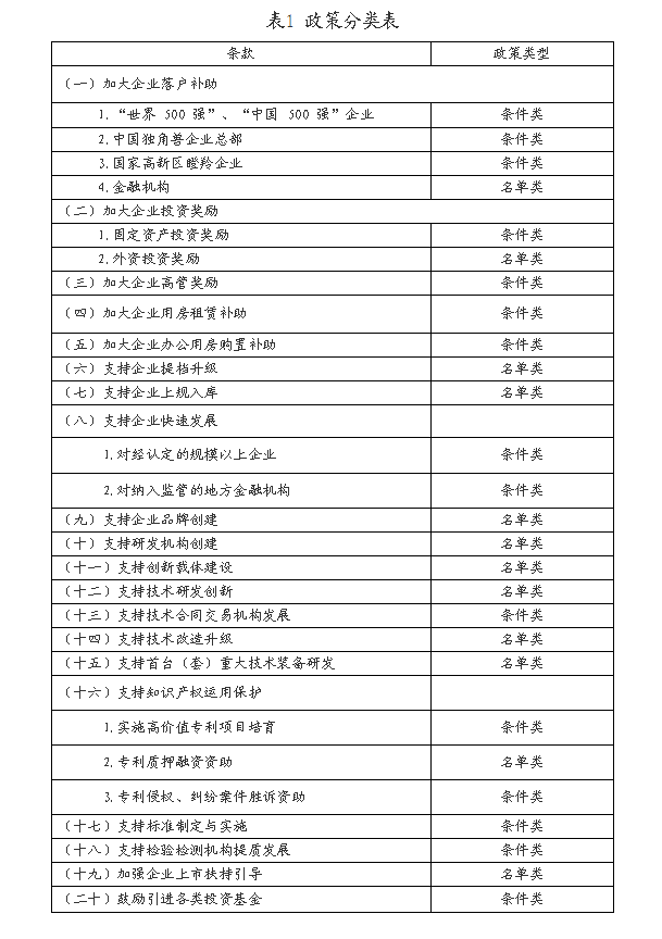 《济南新旧动能转换起步区关于促进企业发展的若干政策》涉及奖励事项分为“名单类”和“条件类”两类(见表1)。