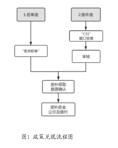 (一)“名单类”奖补事项是指在省市认定及奖励基础上,可实现“免申即享”的奖补事项,无需企业提交申报资料,管委会向企业确认申领意愿后,按照程序拨付相关奖补资金(见图1)。
