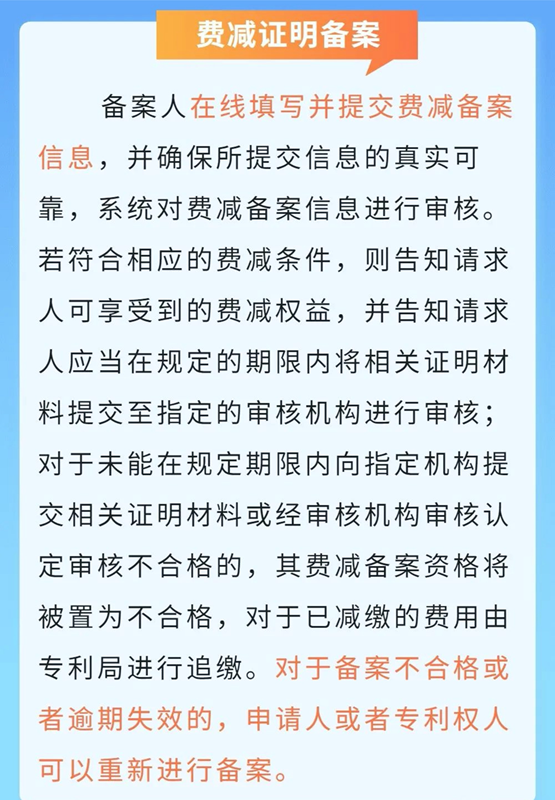 申请人或专利权人通过费减备案系统在线填写并提交备案信息,若审核通过,则在一个自然年有效期内,该申请人提出专利费减请求的,即可按照《专利收费减缴办法》享受相应比例的专利费用的减缴,无需按照专利申请逐件再次提交专利费用减缴证明。申请人或专利权人在费减备案时须选择预费减备案的年份,每年的最后一个季度(10月1日)起开放下一年度的备案,以便于申请人或专利权人提前备案。