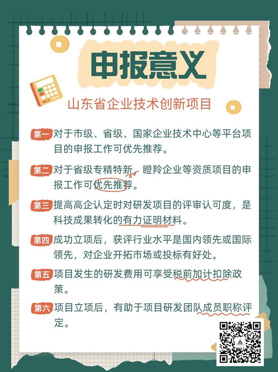 作为省级项目,山东省企业技术创新项目计划审批通过后,不仅利于企业申请重大科技项目,更是申请其他科技项目的加分项,对于意向申报高新技术企业等资质类及企业技术中心等平台类项目的企业而言,山东省技术创新项目无疑是企业最易突破且最应申报的省级项目之一。