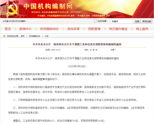 根据《党和国家机构改革方案》和《党中央、国务院议事协调机构优化调整方案》,经报党中央、国务院批准,现将工业和信息化部职责、机构、编制调整,2024年由工信部管理国家高新技术企业认定工作。