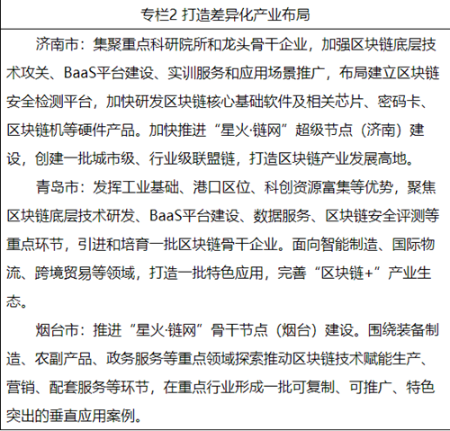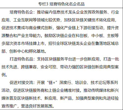 2.加快布局特色产业。推动有条件的市聚焦区块链技术产业化、特色化应用,打造一批基于特定行业、特定场景的垂直应用案例,形成差异化发展路径。支持区块链创新企业集聚、产业特色突出、人才优势明显的区域,加快布局建设一批产业园区和集群。(省发展改革委、省工业和信息化厅)