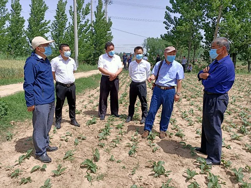 靳光乾教授到田间地头,实地调研了赵庄村紫苑、丹参、无花果种植情况,考察了赵庄村的土质,询问了种植户的种植情况。从当前市场需求量、当地土质适合率、种植技巧、病虫害防治等方面给予了技术指导,并对起垄技术以及垄间套种等给予了好的建议,真正做到了送技术下乡,面对面手把手授业,农户们表示很受益。